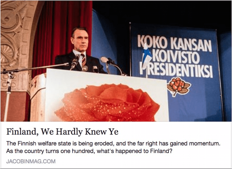 But here’s a more urgent story you aren’t likely to see: much of what once made Finland an exceptional place to live is being systematically dismantled. Finland should not be held up as a beacon of equality and progress. All the media hype and myths notwithstanding, there is no secret Nordic formula for social justice. The famed Finnish welfare state, while still much more generous than the US’s, mirrors the trajectory of other industrialized nations, from its advancement after World War II to its current erosion. And now, with the curtailment of the welfare state, political space is opening up the far right.